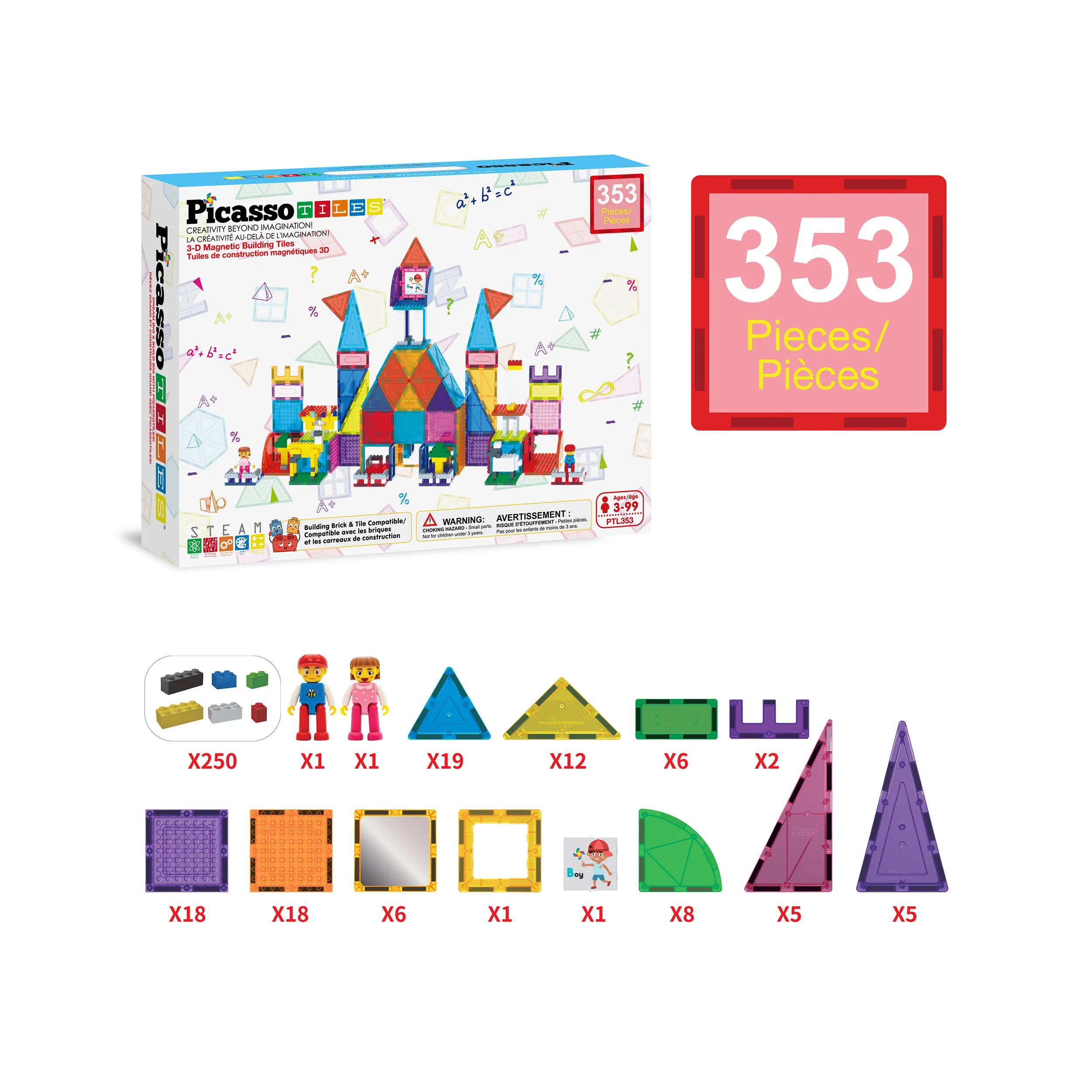 PicassoTiles 353pc Combo Set (PTL353) includes 250 magnetic brick pieces, 100 magnetic tile pieces, 2 character figures, and 1 printed insert piece. Features mirror tiles, curved roof pieces, and door and window tiles for imaginative pretend play. Encourages spatial skills, engineering thinking, fine-motor control, and teamwork for ages 3+.