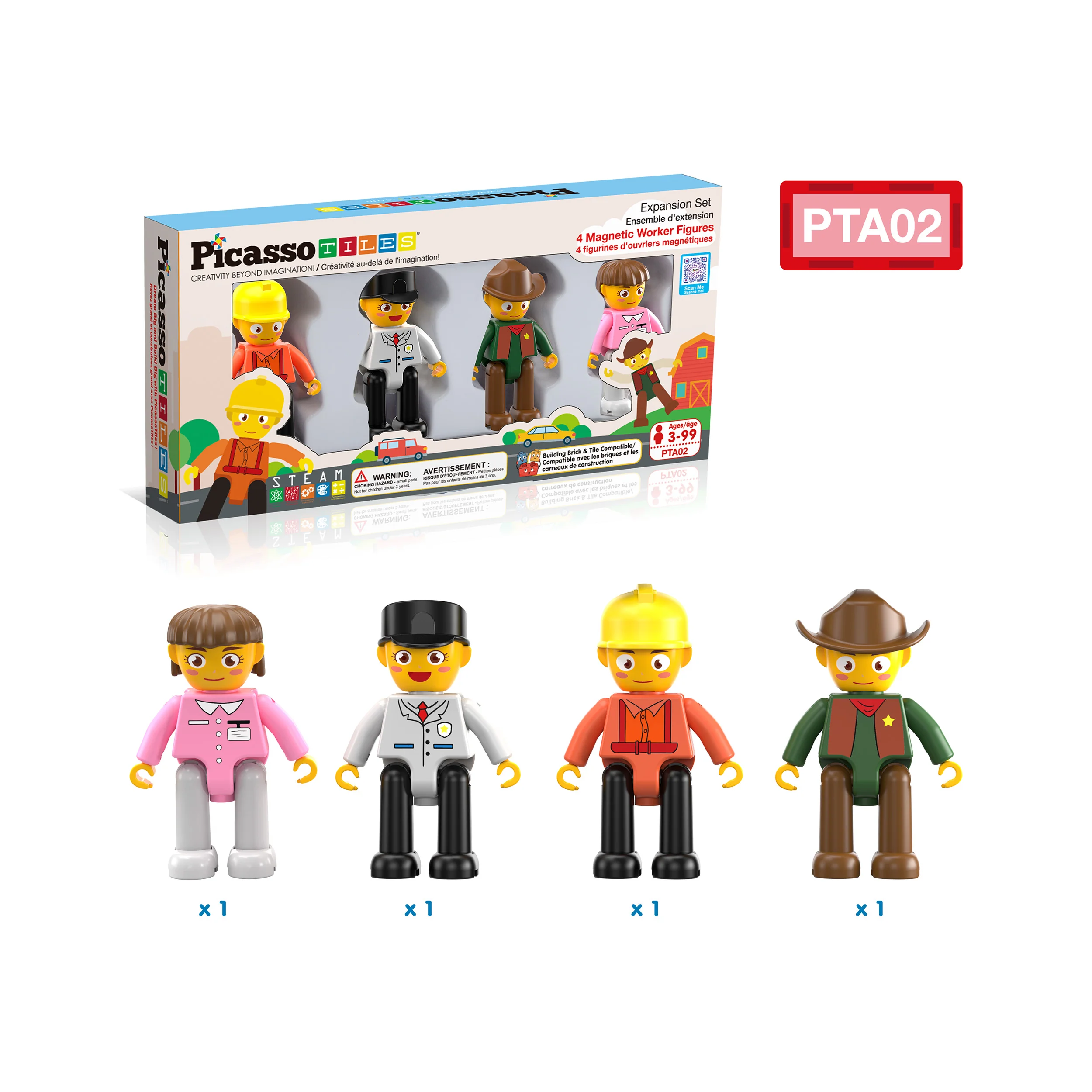 PicassoTiles 4pc magnetic character figures includes a fireman, policewoman, cowboy, and nurse. These figures can be used as standalone toys or combined with other PicassoTiles construction sets to enhance designs and spark creativity. Perfect for encouraging imaginative play and storytelling. (SKU:PTA02)
