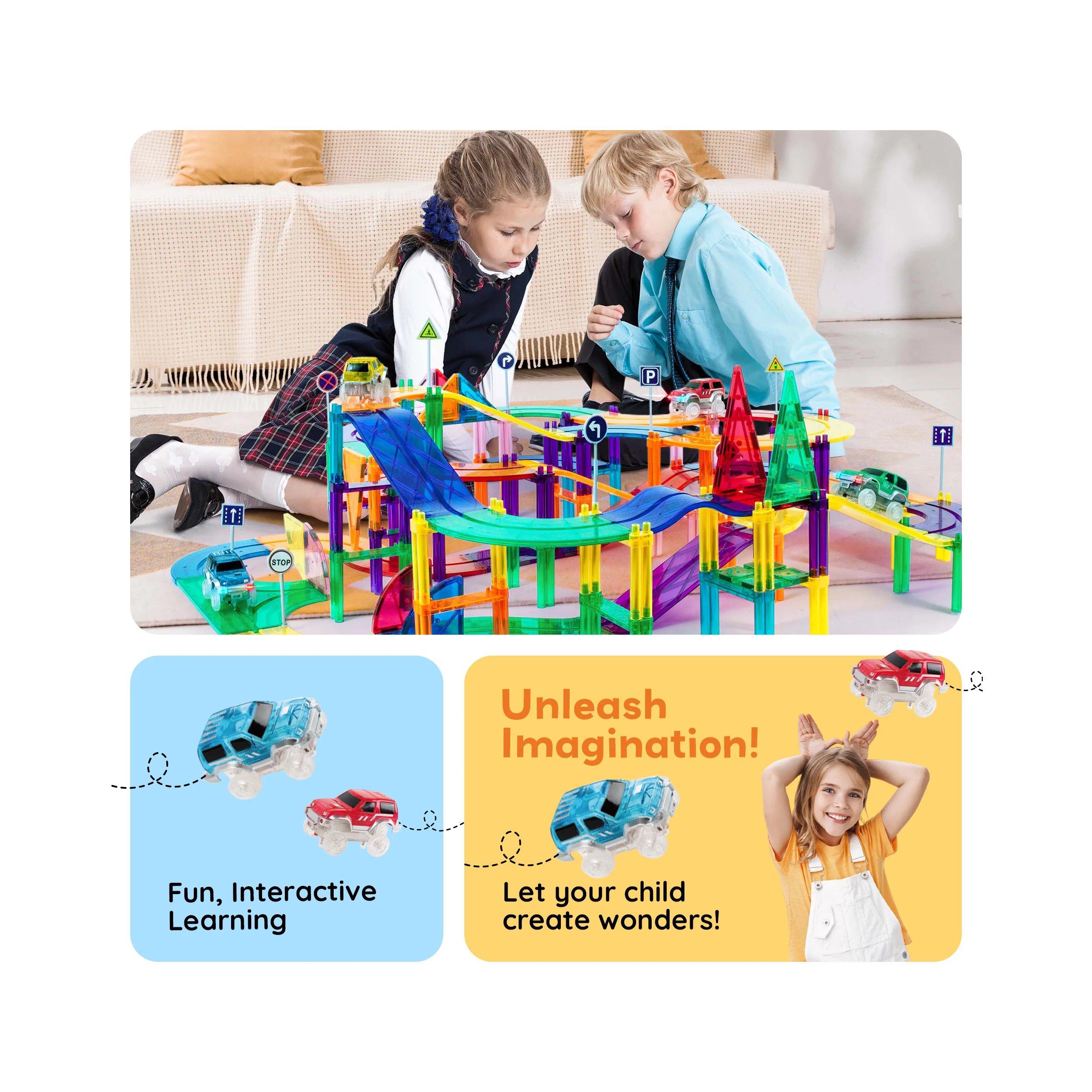 PicassoTiles magnetic race track set (PTR50) includes 50 snap-together pieces with 2 LED cars for building exciting 3D racecourses. Kids can design custom tracks, race vehicles, and develop creativity, spatial skills, and hands-on STEM learning through screen-free play.