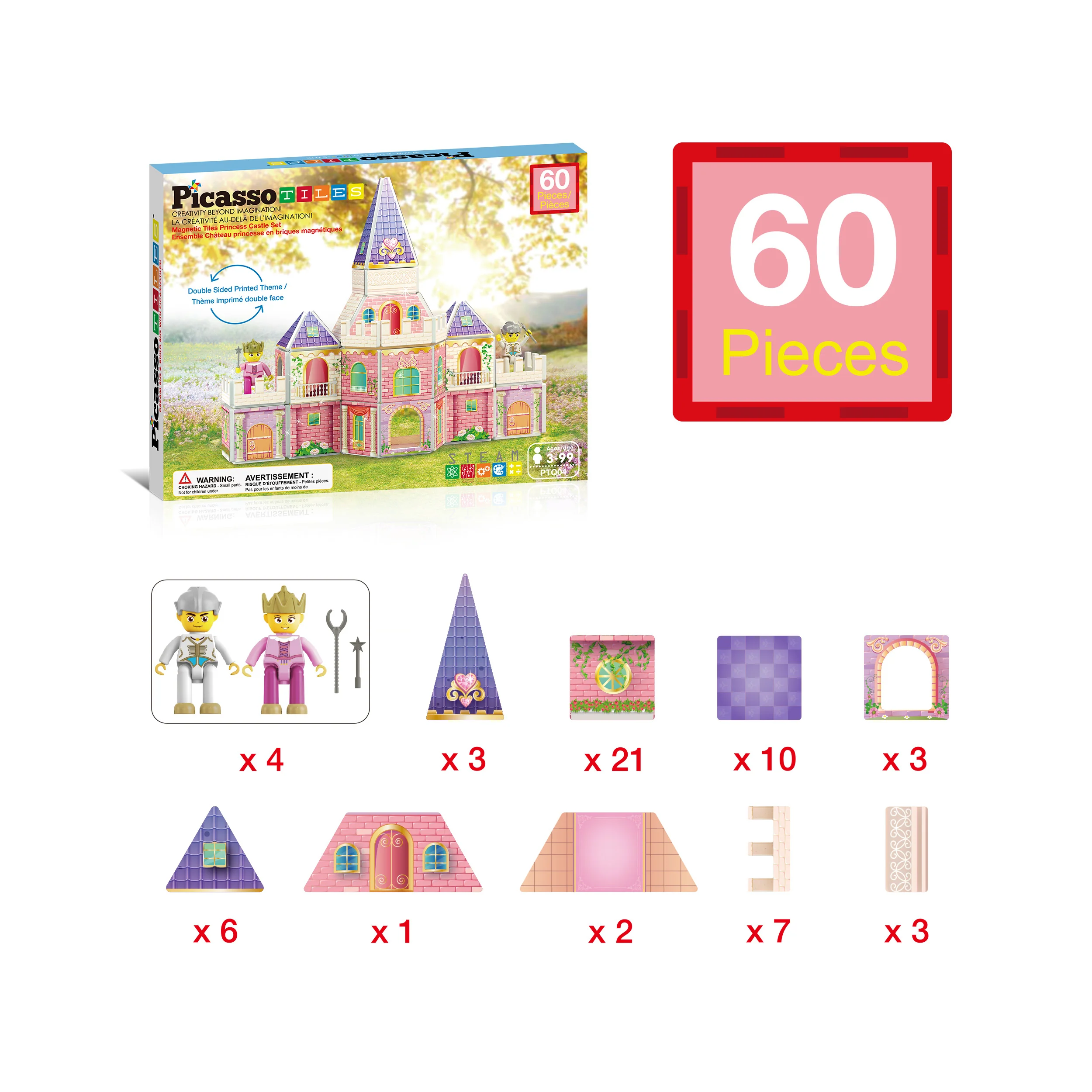 PicassoTiles 60pc Magnetic Princess Castle Set (PTQ04) invites kids to build magical castles with double-sided tiles and two action figures. This playset encourages storytelling, builds creativity, and supports emotional intelligence through imaginative open play.