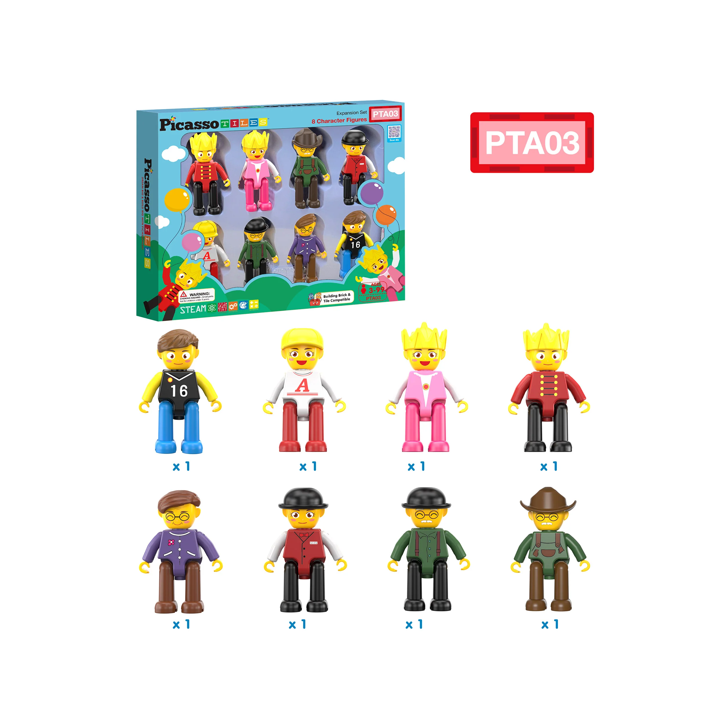PicassoTiles 8 piece character action figure toy set is designed to complement your magnetic tiles toy block construction toy collection. Whether used independently for action-packed adventures or combined with other sets to enhance construction projects, these figures add a new dimension of creativity and excitement. (SKU:PTA03)