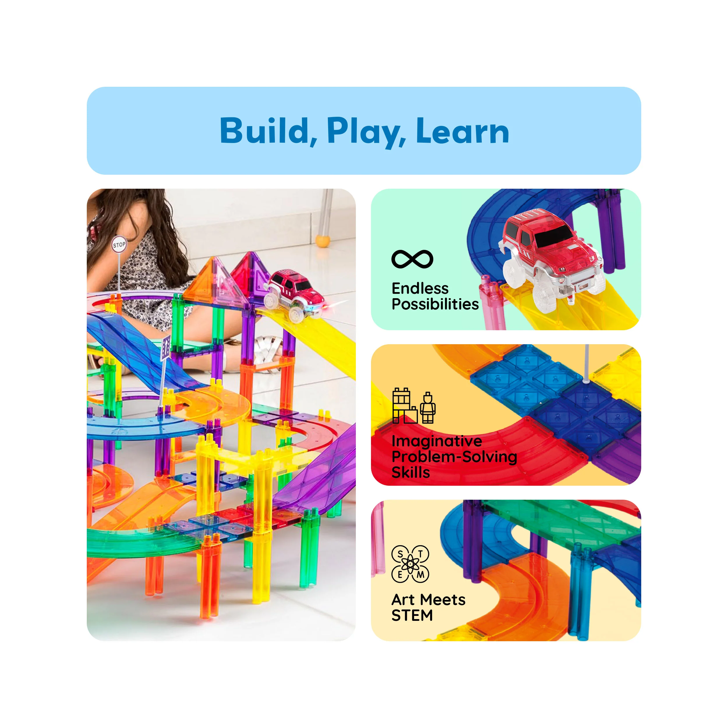 PicassoTiles magnetic racetrack set (PTR80 ) features triangle tiles, curved tracks, and squares for designing exciting custom courses. Kids snap pieces together, race light-up LED cars, while explore shapes, patterns, and logic through hands-on STEM learning and creative open-ended play.