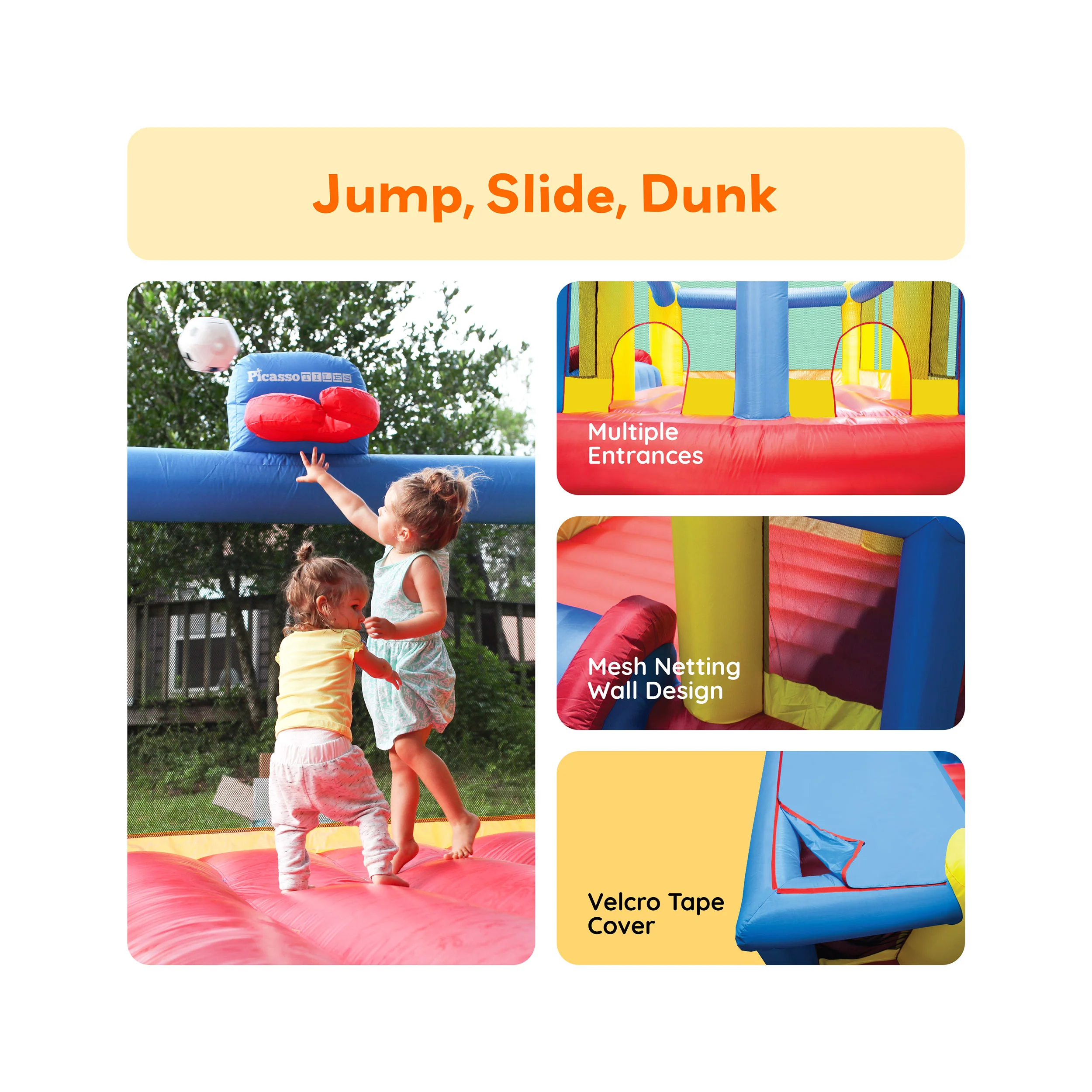 PicassoTiles Inflatable Jump Slide Dunk Bounce House (KC102) sets up in under 2 minutes for fast, active outdoor play. With a built in basketball rim, 4 sports balls, and a retractable shade cover, kids can slide, dunk, and stay protected while enjoying summer fun anywhere.