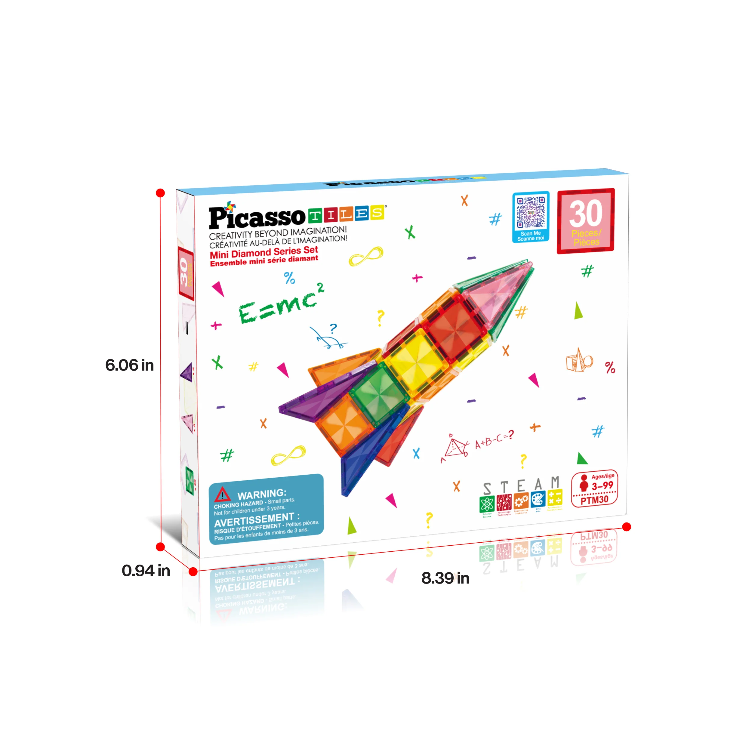 The PicassoTiles 30-piece magnetic building block rocket travel-size toy (SKU: PTM30) features tile blocks with a unique diamond-shaped surface. It can be used independently or integrated with other travel-sized magnet construction toys in our Mini Diamond Collection as add-on pieces. This integration offers limitless possibilities for creating structures that foster children's creativity and intelligence.