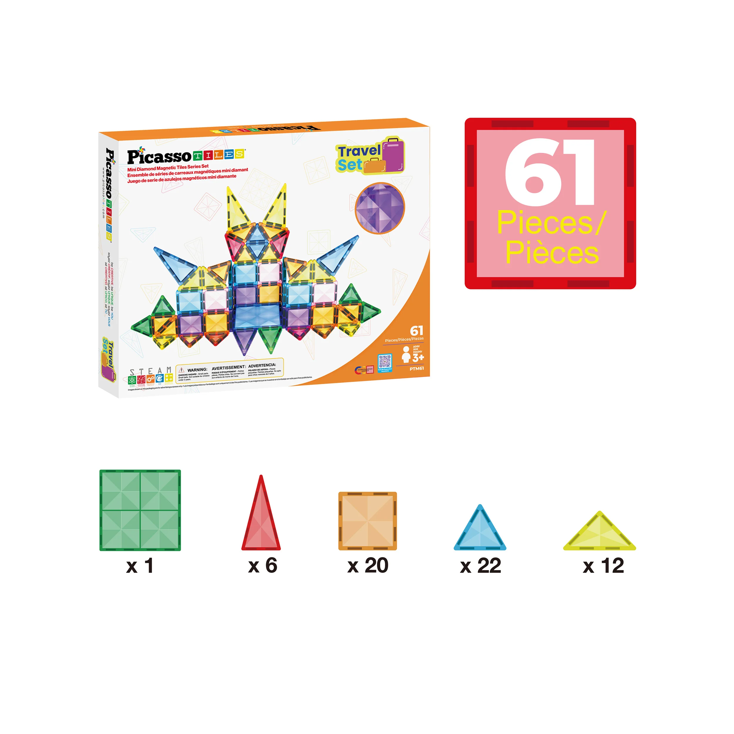 PicassoTiles 61 piece magnetic building block travel-sized playset (SKU: PTM61) features a unique diamond-shaped surface. It can be used independently or seamlessly integrated with other PicassoTiles mini magnet construction toys as add-on pieces, offering limitless possibilities for creating structures that encourage children's creativity and intelligence.